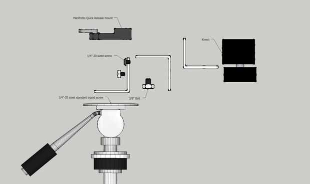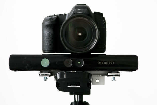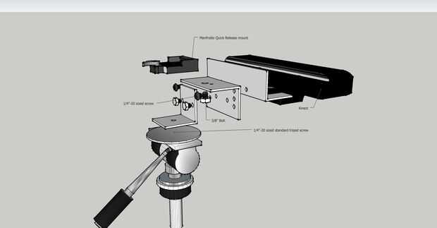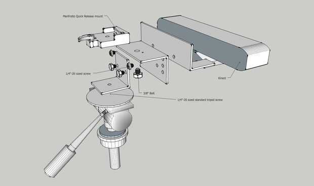La montura está diseñada con las siguientes restricciones; que la relación entre el Kinect y la cámara se queda fija y no susceptible de chocar o deslizarse, las lentes están tan cercanas como sea posible sin oscurecer otra uno, que todo el sistema puede ser fácilmente montado en un trípode.