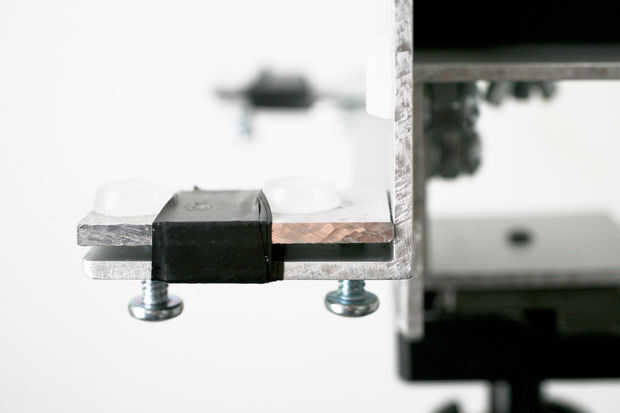 El último paso es hacer ajustables 'bandas' para cambiar el ángulo del Kinect. He hecho esto golpeando los agujeros en las patas de la montura con la broca de 10-24 y tiras de 1"-ancho de corte del aluminio ángulo como insertos. Ver las fotos.