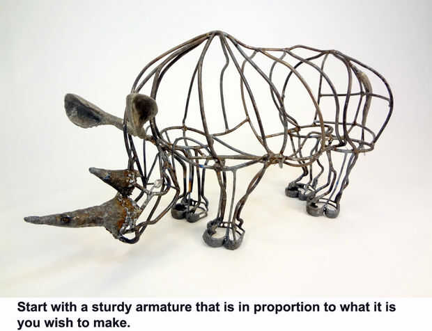 Soldar un marco que está en proporción directa a sus dibujos, foto o estatuilla. Aquí hice los cuernos y uñas en chapa de acero y soldada al marco. La cola se realiza utilizando varios hilos de alambre del lazo del rebar.