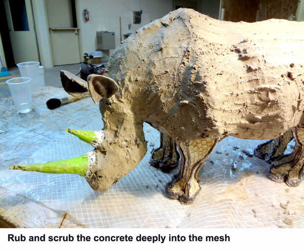 Con una reparación escultural concreto llamada "Planitop X" por Mapei Corporation, había frotado y había fregado profundamente una fina capa en la malla para que no son vacíos. Este tipo de reparación de hormigón se configura rápidamente. Hay otros tipos de reparación de hormigón en el mercado que puede utilizar.