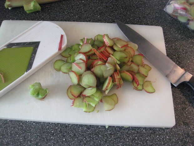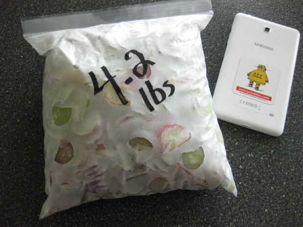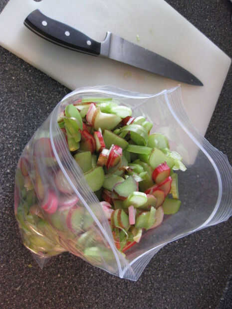 La bolsa y congelar durante al menos 24 horas. La congelación le ayudará a romper las paredes celulares en el ruibarbo y se soltará más jugo. Esto le dará más sabor y en teoría, una sombra de color rosa profundo.