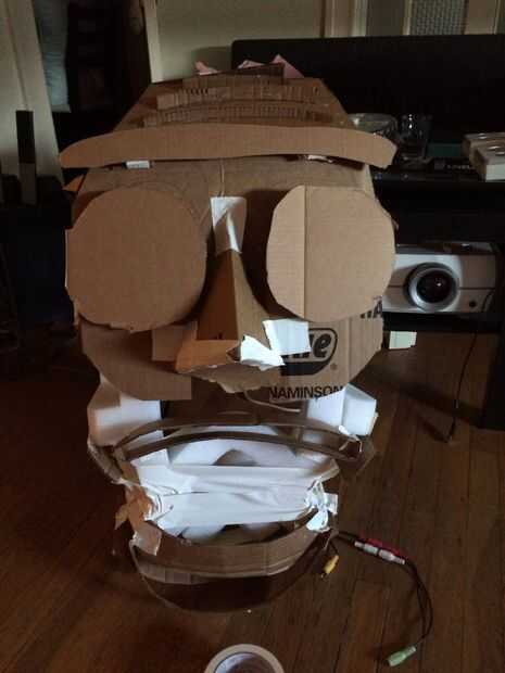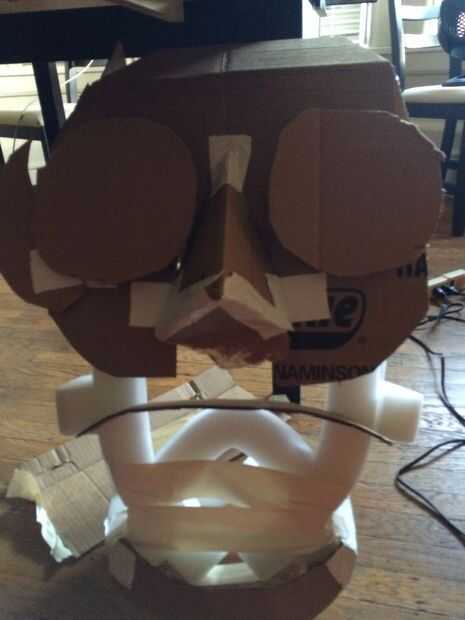 Usted necesitará hacer un marco para la cabeza gigante. Es posible hacerlo completamente fuera de la cartulina, pero tuve poco agradable amortiguación de espuma que había sido utilizada para el embalaje material para mi impresora 3D. Cinta adhesiva mantiene juntos muy bien. Pegamento caliente también es útil para la adhesión rápida de cartón a cartón. Tenga cuidado al usar otros materiales que pueden derretirse o quemarse más fácilmente.