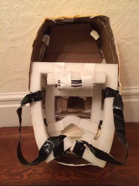 O más exactamente, sus hombros. Me agregó dos tiras de cinta de conducto a la parte posterior del marco y cayó sobre mis hombros como una mochila inversa. También se puede ver que grabó una pequeña toalla de plato allí por lo que mi cabeza no empujar directamente contra el marco.