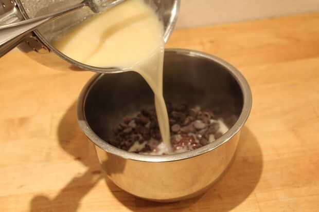 Deben ser chips de chocolate en un tazón mediano, resistente al calor intenso. Verter esta mezcla caliente de crema pesada sobre los chips de chocolate y revolver hasta que los trocitos de chocolate se derritan.