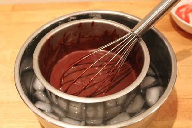 Agregue el jugo de frambuesa y luego la taza de lugar en un baño de hielo, como se muestra arriba. Revolver constantemente hasta que el helar es frío y empieza a endurecer a los lados.