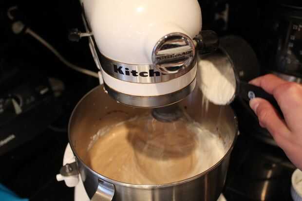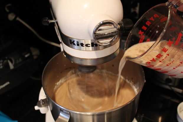 Luego añadir harina y mantequilla mezcla alternativamente, harina de primera, y suero de leche, luego harina, etc., en última instancia, comenzando y terminando con la harina. Raspe los lados y seguir mezclando durante unos segundos más, hasta sólo combinar. No mezcle.