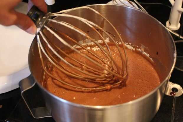 Ahora es el momento de todo lo que has preparado añadir: Añadir a la mezcla de chocolate y mantequilla a la mezcla de huevo azúcar y mezclar hasta combinar. Chicotazo. solo revuelve lentamente en él.