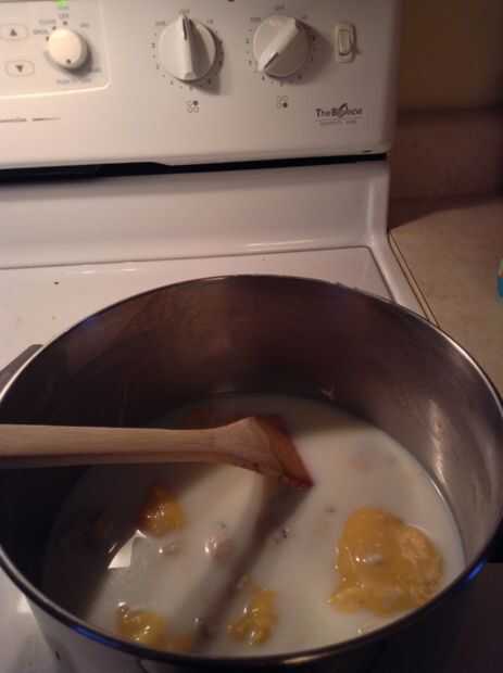 Vierta sus dos latas de leche en la olla y fijar a fuego medio-bajo.