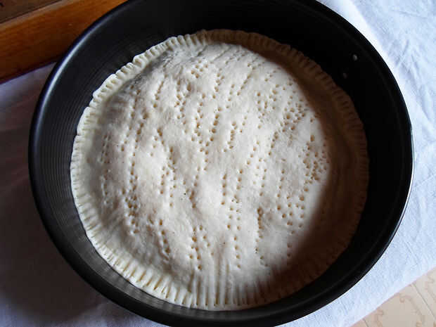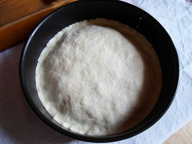 Ahora Levante el disco de masa con las manos y colóquelo sobre el jamón y la mozzarella, el derecho en la bandeja.