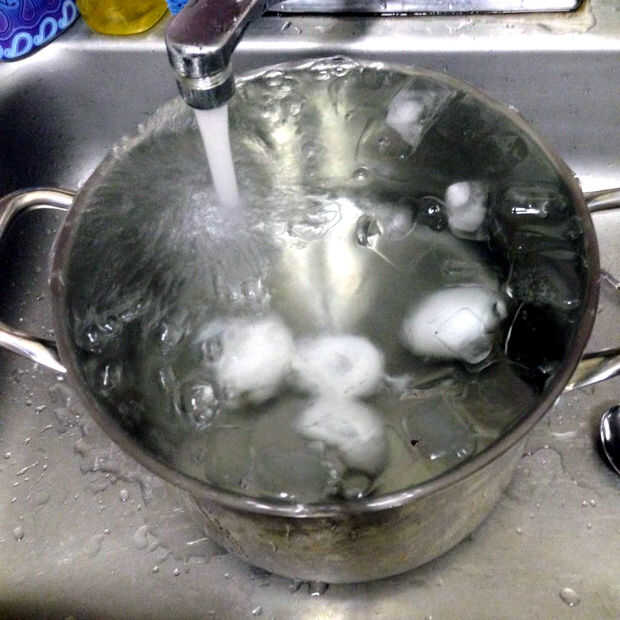 Ahora rápidamente enfriar los huevos por agua fría sobre ellos. Una vez que esté casi lleno de agua, añadir un montón de hielo para convertir todo esto en un baño de hielo para los huevos.