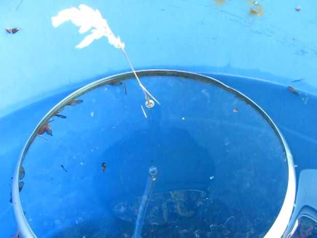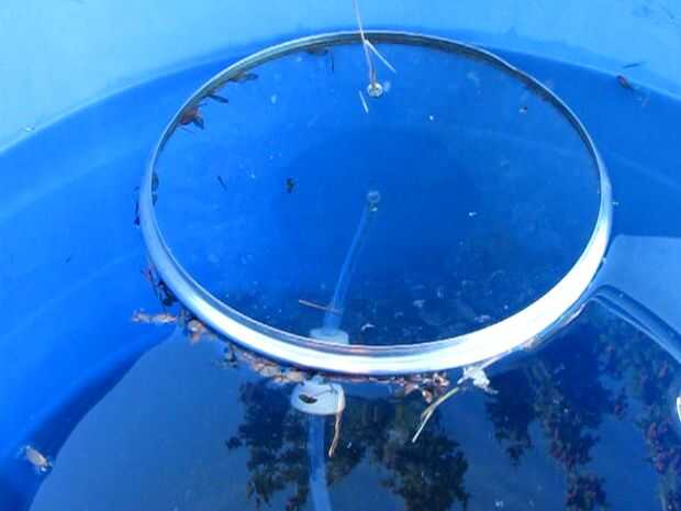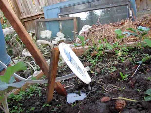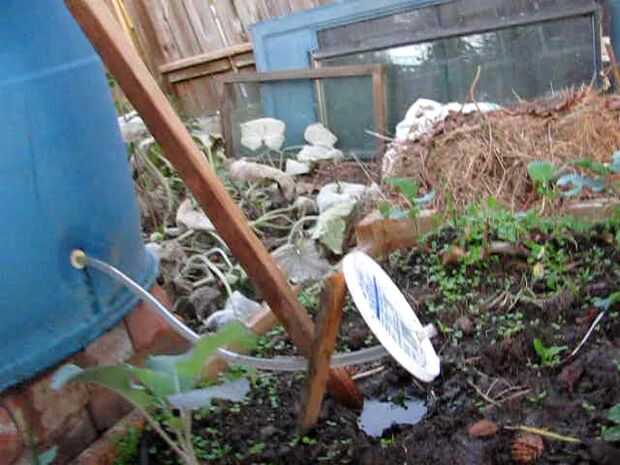 Riego de baja tecnología de un rainbarrel. El barril de agua puede durar una semana o más. (2 / 4 paso)