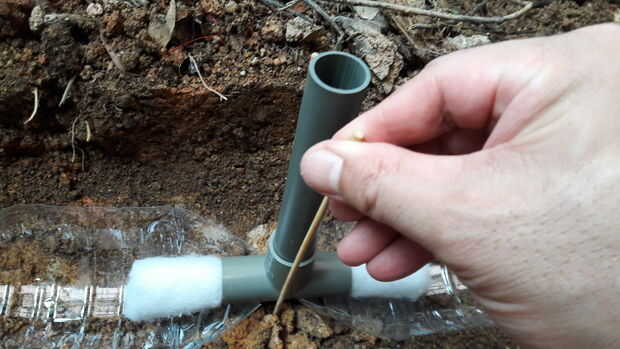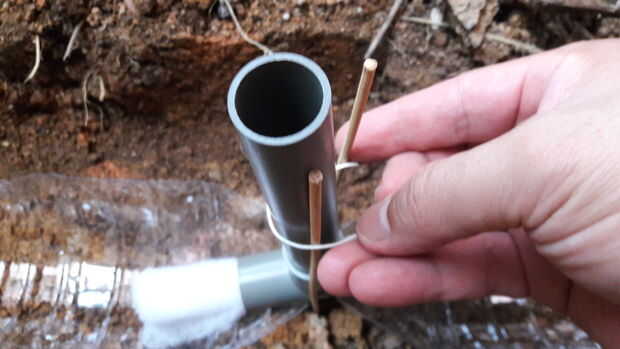 2. Me fije el tubo con el pincho de bambú y sujetar con un cordón.