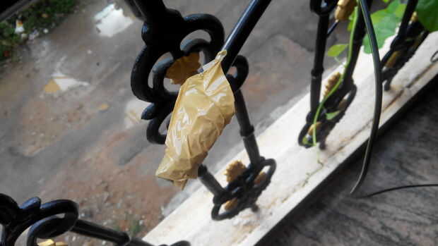 Mi suegro descubrió una manera de reutilizar botellas o para riego por goteo. Esto es cómo. Los materiales son botellas vacías, palillo de bambú, hisopo de algodón (bastoncillos de algodón) y cadena. Las herramientas son de tijera, pinza, clavo, cuch