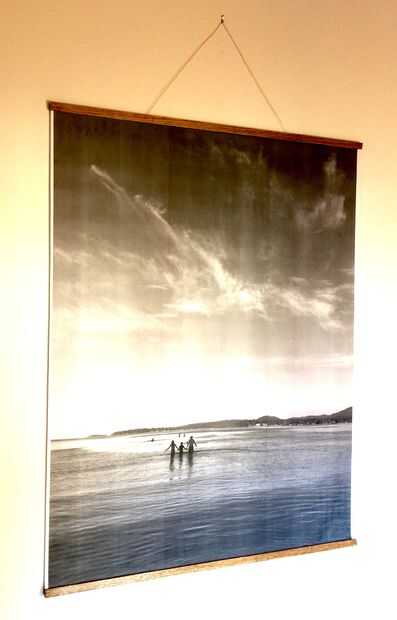 Aquí está una manera simple pero eficaz de colgar un poster grande - fino tiras de roble fijando la impresión en la parte superior e inferior y suspendido por un hilo de cobre. Son baratas y fáciles de hacer y personalizar.
