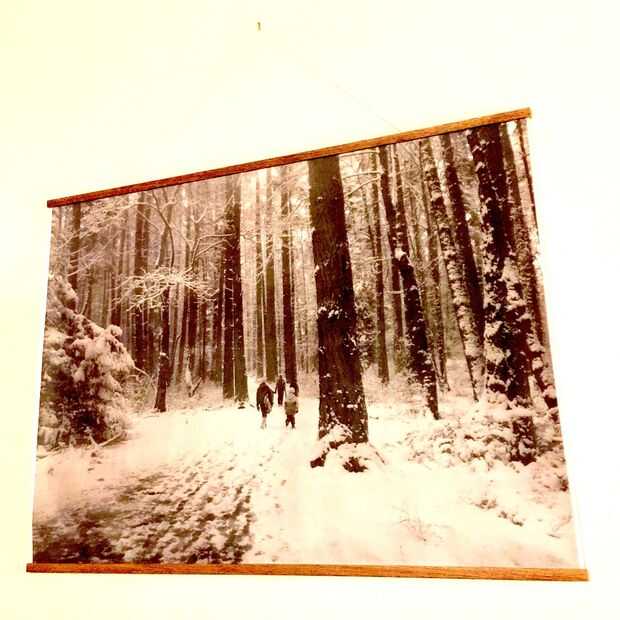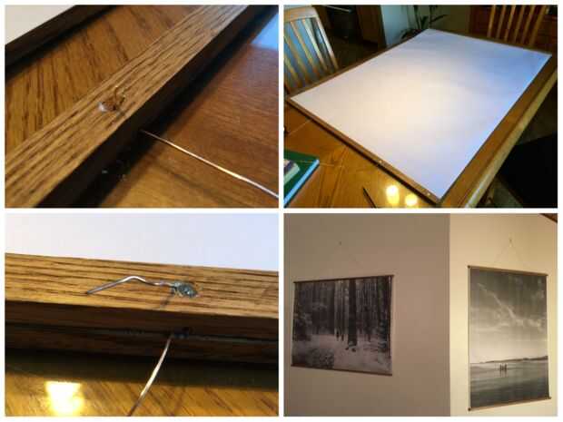 "Encuadre" de los carteles era fácil - sólo alinearon las tiras de roble y atornilladas por la parte posterior, directamente a través de la impresión. Al hacer los rieles superiores, utilicé un trozo de alambre de cobre 3' de largo y alimentado a través de los orificios como se muestra, entonces agregados tornillos para atrapar el hilo (esto debería funcionar igual de bien con una cuerda). Colgar en un lugar de su elección. Estamos muy contentos con el producto terminado y terminó con 24 pies cuadrados de arte personalizado barato.