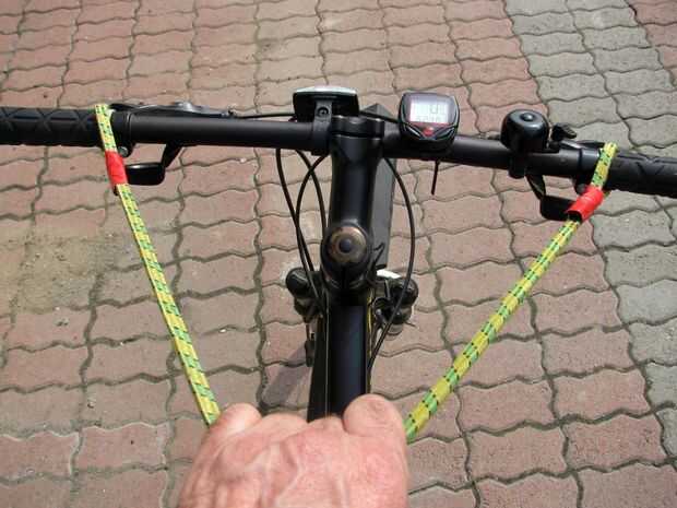 Esto es una idea algo loca que es realmente útil. De vez en cuando me gusta sentarse erguido en mi moto sin agacharse para sostener el manillar - pero no me gusta no andar "manos" - que es extraño porque me gusta montar un monociclo. Así consiguió esta idea para hacer unas riendas y sorprendentemente funcionan muy bien.