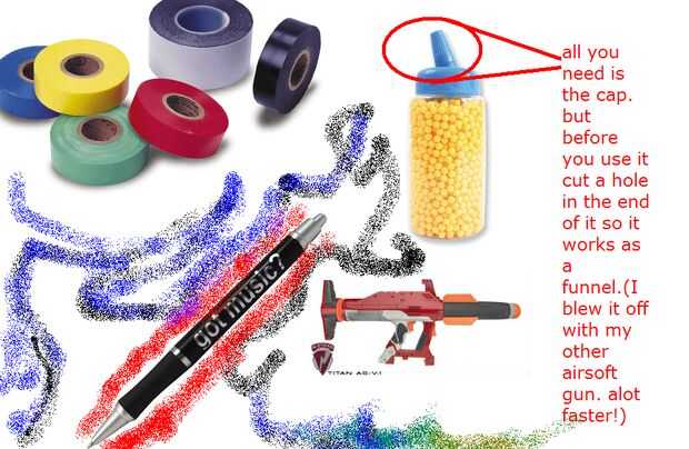 Todo lo que necesitas es un tapón de una botella del bb de airsoft, una pluma o paja, pistola de pegamento caliente, cinta eléctrica y la titan nerf como-v.1.