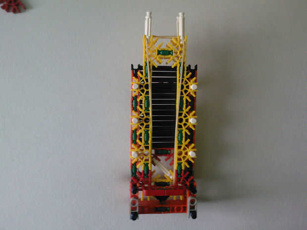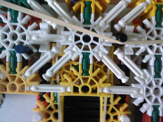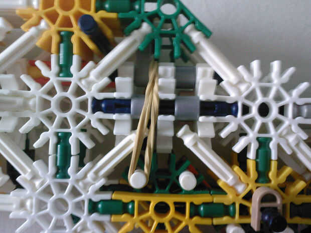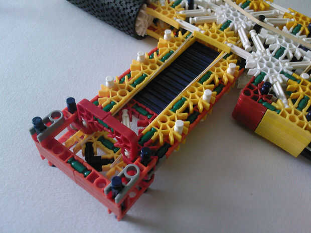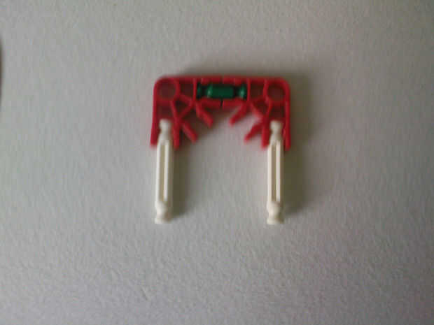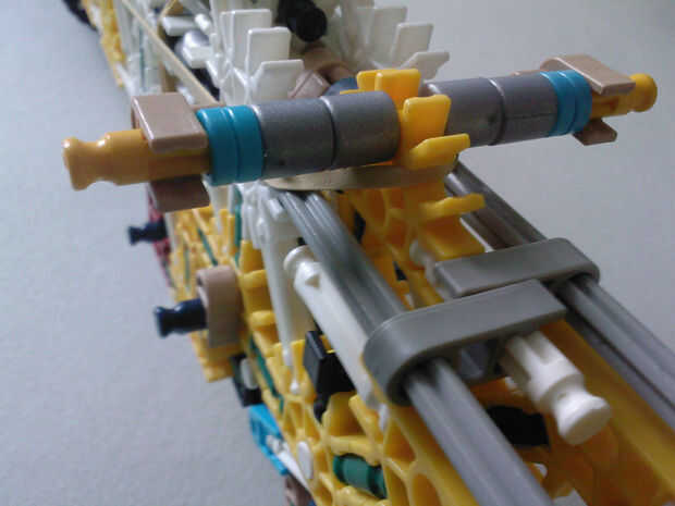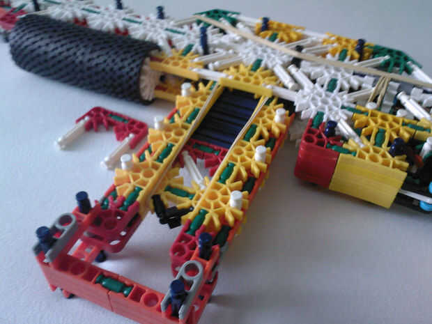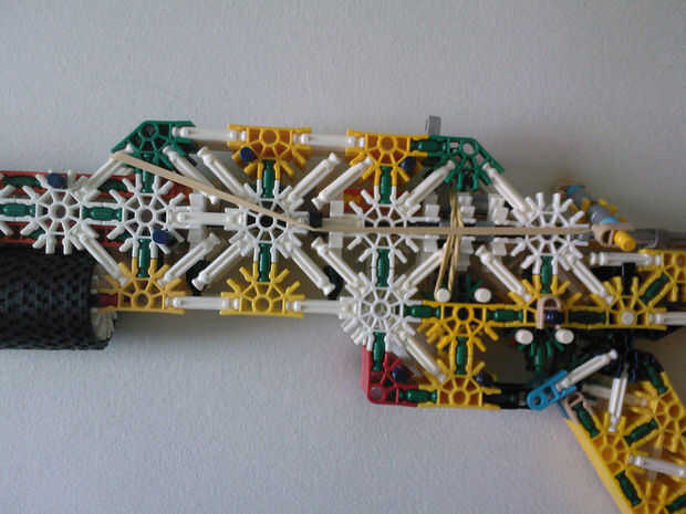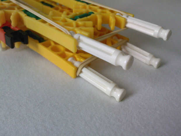 2-3. esto es cómo el rubber band(s) principal. Si utilizas mucho cortarla puede adjuntar a una de las barras azules en el cañón falso.