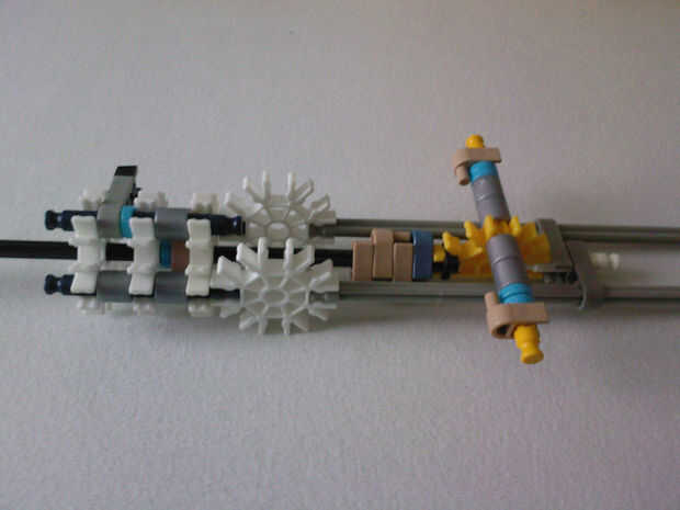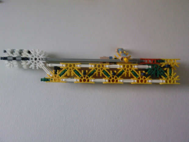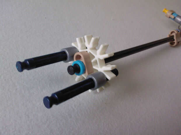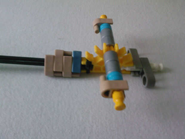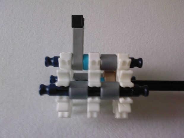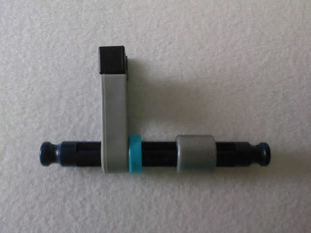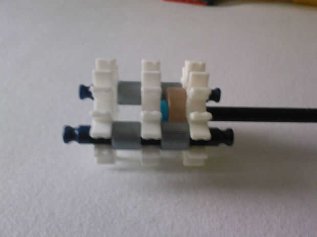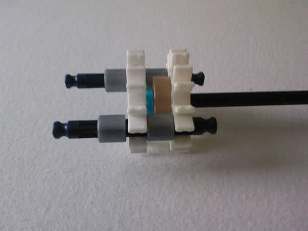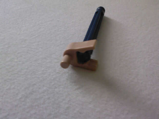 4. ahora Inserte el perno de la leña esto. Este es el clip tan debilitado. Es importante que el percutor está en un ángulo no recto, así que tiene el bronceado en la misma dirección como en la imagen. Si lo pones recto hacia arriba, hacia abajo o hacia los lados el percutor se captura en la munición, lo que hace muy difícil a tire hacia atrás el percutor. Usted puede esperar con una de estas barras azul y encájelo en más adelante para que sea más fácil de construir.