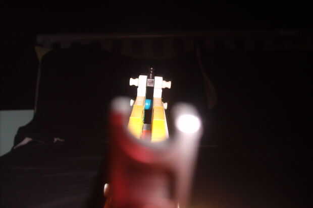 bien, Hola. Este es mi nuevo rifle de asalto. He hecho esto en unas 3 horas. Resultó mucho mejor de lo que esperaba. Dispara unos 40 pies pero tiene un muy buen disparador fuerte así que tal vez 50 pies. El bloque de disparo en el cañón funciona como
