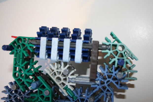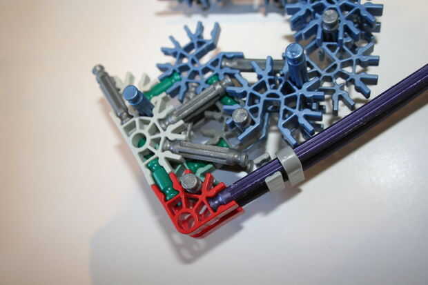 2. Añadir esto. El segundo grupo de conectores azules es hacer pivotar para mostrarle la mejor manera de agregarlos - conector marrón primero, luego añadir los conectores azules que hacen pivotar, luego prensa verde barras para mantener en su lugar, como se muestra en tres.