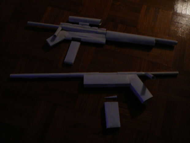 por lo que has visto las fotos del rifle, ahora aquí es cómo hacerlo.Paso 1: se necesita: un bolígrafo/rotuladormedio hecho pepakura rifle de asalto o un cuadro de referencia de escala corta hacia fuera y listo para usartijeraspegamentoaguaperiódicoc