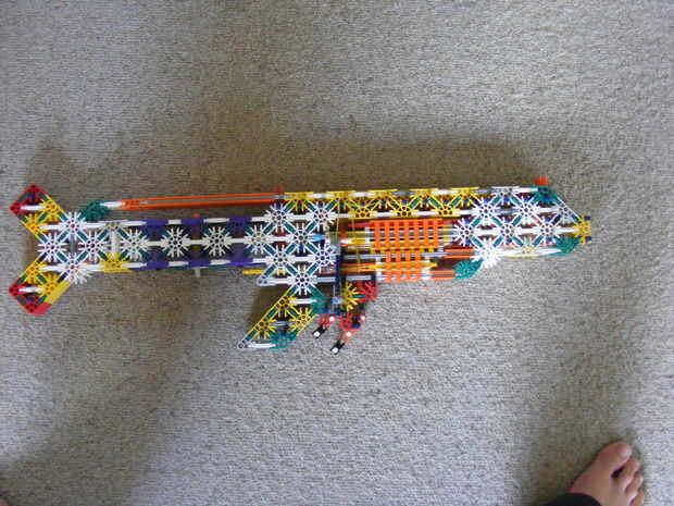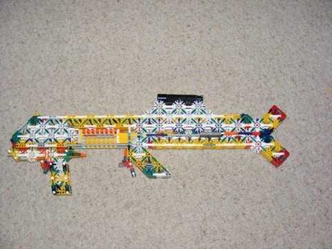 bien, Hola. Este es mi nuevo rifle de asalto. He hecho esto en unas 3 horas. Resultó mucho mejor de lo que esperaba. Dispara unos 40 pies pero tiene un muy buen disparador fuerte así que tal vez 50 pies. El bloque de disparo en el cañón funciona como