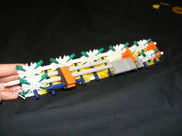 bien, Hola. Este es mi nuevo rifle de asalto. He hecho esto en unas 3 horas. Resultó mucho mejor de lo que esperaba. Dispara unos 40 pies pero tiene un muy buen disparador fuerte así que tal vez 50 pies. El bloque de disparo en el cañón funciona como