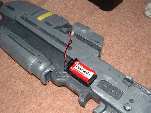 Meses más tarde, finalmente decidió añadir una solución menos rígida para proporcionar el LED con el poder. Antes, solo apreto la batería 9v contra el alambre largo que sobresale del contador de munición, pero no quiero ir al esfuerzo de cortar una ranura para la batería, volver a colocar los cables, la pintura sobre ellos.