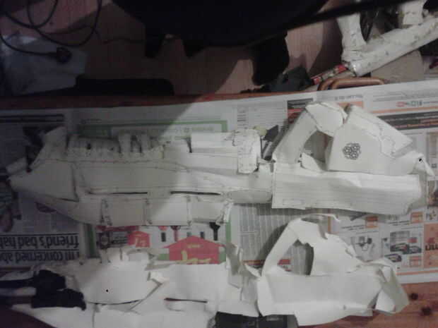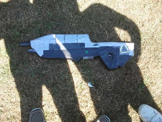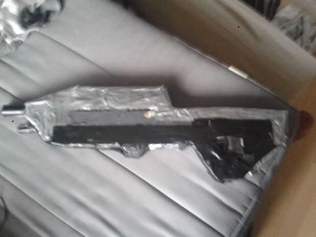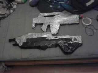 aquí es un proyecto reciente que completado. es un rifle de asalto hecho de cartón, cinta adhesiva, papel maché y medio hecho construir de pepakura. te puse un tutorial pronto ;)