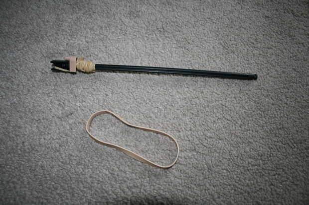 bien, Hola. Este es mi nuevo rifle de asalto. He hecho esto en unas 3 horas. Resultó mucho mejor de lo que esperaba. Dispara unos 40 pies pero tiene un muy buen disparador fuerte así que tal vez 50 pies. El bloque de disparo en el cañón funciona como