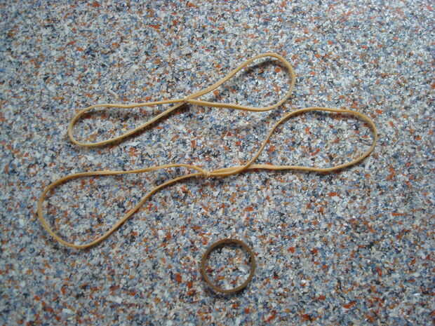 Voy a explane lo que está sucediendo en la primera foto. tomar dos banda de goma y lugar uno a mitad de camino sobre el otro. Luego, tome el extremo sobre la banda superpuesta y tirar debajo de la banda debajo de él, en el otro extremo de la banda, luego tire. lo que ves es la resould de este movimiento y le permite utilizar dos twoghther de goma como si fuera sólo uno. Repita el mismo prosas nuevo con otras dos bandas de goma hasta que han hecho dos goma larga de cuatro.
