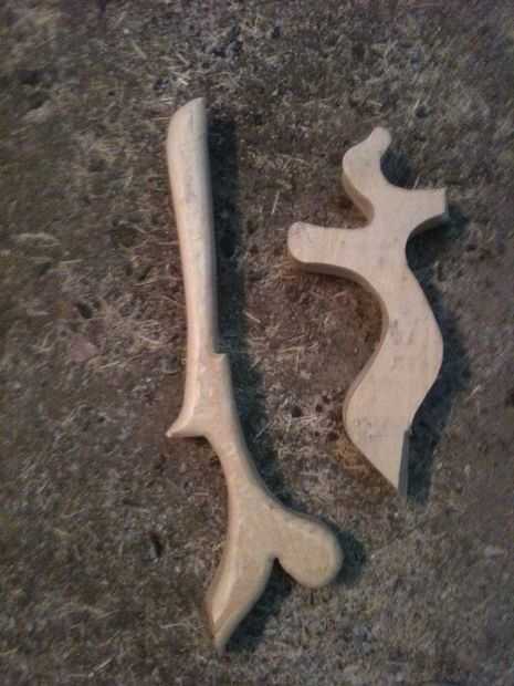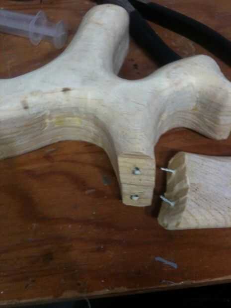 Los otros dos frenos provenían de la parte rota la culata. Primero no estaba muy seguro cómo solucionar adecuadamente ese freno justo pegado y aprovechado como otro. Sin embargo, esto no aguantar por mucho tiempo y cayó mientras lija. Así que acabé empujando dos clavos en el stock y luego hacer los agujeros correspondientes en la pieza rota. Esto tomó un poco de trasteo, pero estoy muy contenta con el resultado.