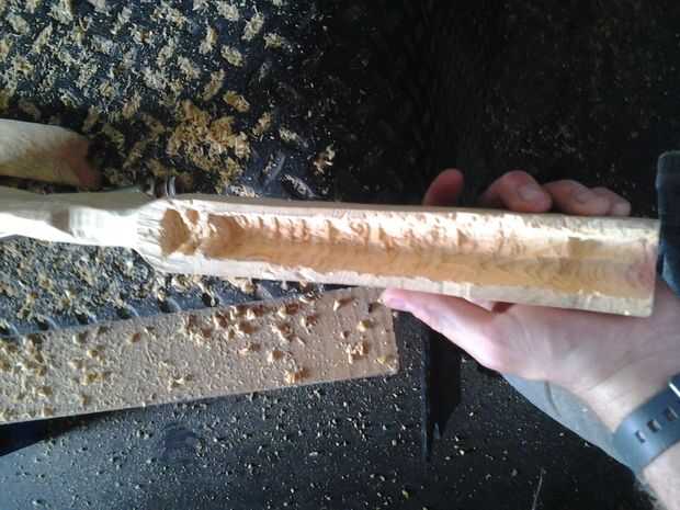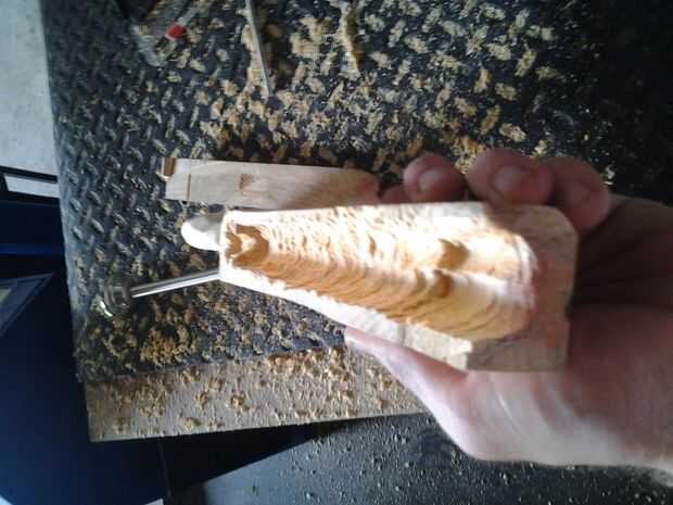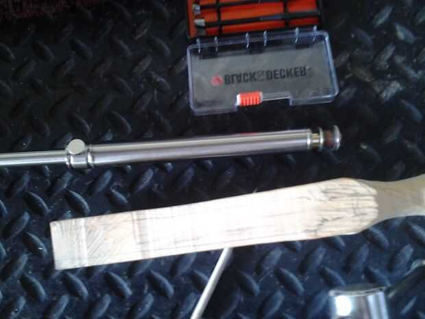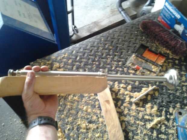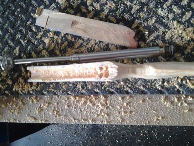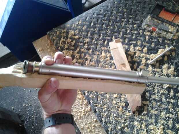 El cañón está situado en a medio camino, y utilicé algunos correas metálicas dobladas que tenía aerosol pintado para fijar abajo. La tuerca de ajuste para la longitud del cañón era un tornillo desmontable y por lo que utilicé para alinear el cañón con las correas metálicas para el barril no se mueve en el corte del surco. Esto también permite el barril a retirarse si es necesario alguna vez. Una correa adicional fue agregada para asegurar el cañón hacia abajo y simplemente se atornilla en la madera.