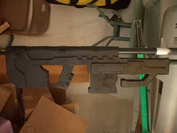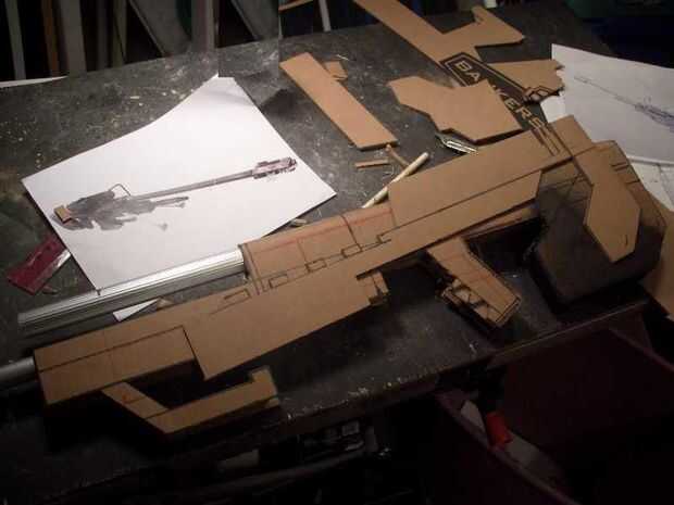 Detalle lateral fue agregado con otra capa de cartón como se muestra en la cuarta foto. Tiras de cartón se pegan entonces entre las dos partes para terminar la estructura de la pistola.