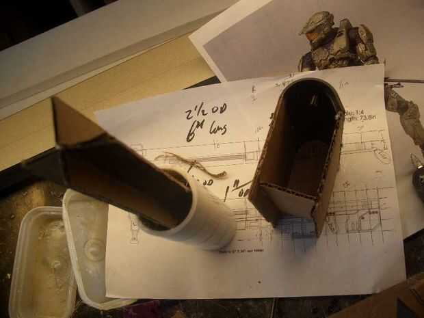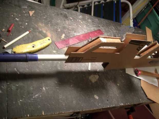 Utilicé una escala de dibujo y otros cuadros de referencia que encontré en internet para obtener la forma general y el tamaño de la arma. El 48" longitud se determinó que el mejor tamaño para la altura de mi hijo. Me dibujó una cuadrícula en la vista lateral del diagrama y sirve para transferir la silueta a la cartulina. Hice dos bandos y pegar los tubos interiores y medios y restos de un mango de madera para añadir soporte a la estructura.