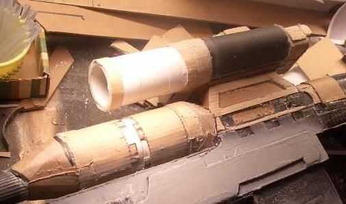 Dos acopladores de 2-1/2" PVC se pegan y se deslizó sobre el cañón principal. Estaba cubierto con un cartón con muescas en el centro para darle el detalle apropiado. Cartón fue cortado y pegado a los extremos en conos para acabar con.