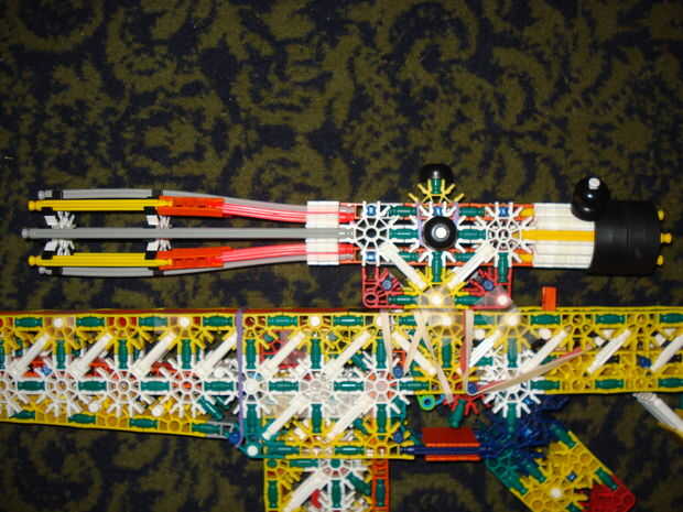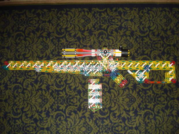 esto es, de lejos mi mejor arma diseñado que he hecho. es muy precisa y con una buena banda de goma tiene un buen rango (40-50 pies). la acción es duradera y el mango diseñado para parecerse a los springfields. está cargada y dispara barras blancas.