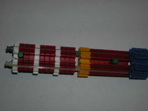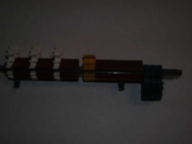 esta es el arma más poderosa de K'NEX creo que porque puede perforar 2 cerveza o COLA puede y destruir disco compacto fácilmente debido a la muy fuerte 4 gomas (yo uso 2 ligas diferentes) también incluye una gran revista para 5 K'NEX largo gris afila