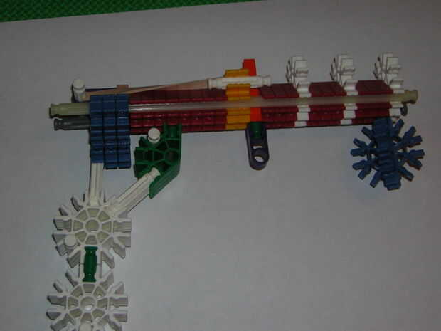 esta es el arma más poderosa de K'NEX creo que porque puede perforar 2 cerveza o COLA puede y destruir disco compacto fácilmente debido a la muy fuerte 4 gomas (yo uso 2 ligas diferentes) también incluye una gran revista para 5 K'NEX largo gris afila