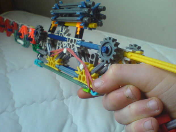 esta es el arma más poderosa de K'NEX creo que porque puede perforar 2 cerveza o COLA puede y destruir disco compacto fácilmente debido a la muy fuerte 4 gomas (yo uso 2 ligas diferentes) también incluye una gran revista para 5 K'NEX largo gris afila