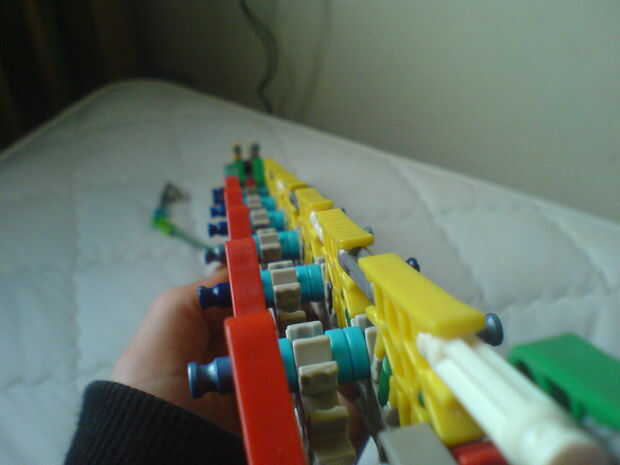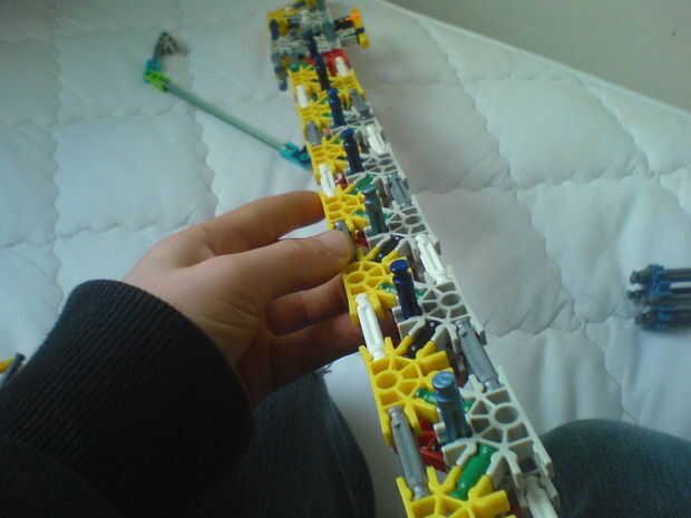 esta es el arma más poderosa de K'NEX creo que porque puede perforar 2 cerveza o COLA puede y destruir disco compacto fácilmente debido a la muy fuerte 4 gomas (yo uso 2 ligas diferentes) también incluye una gran revista para 5 K'NEX largo gris afila
