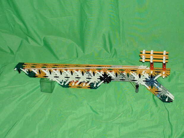 este es mi Rifle de francotirador de la sombra. Fui mejorando mi sniper anterior y odiaba un poco la espalda, así que sólo seguí el barell. He añadido otras partes como un gran mecanismo de Matraca y foregeip. Poco a poco, mejoré más y terminé con esta gran arma. Yo lo llamo el rifle de francotirador "Sombra" porque todavía es bastante precisa en la oscuridad.