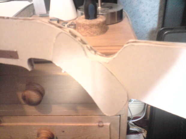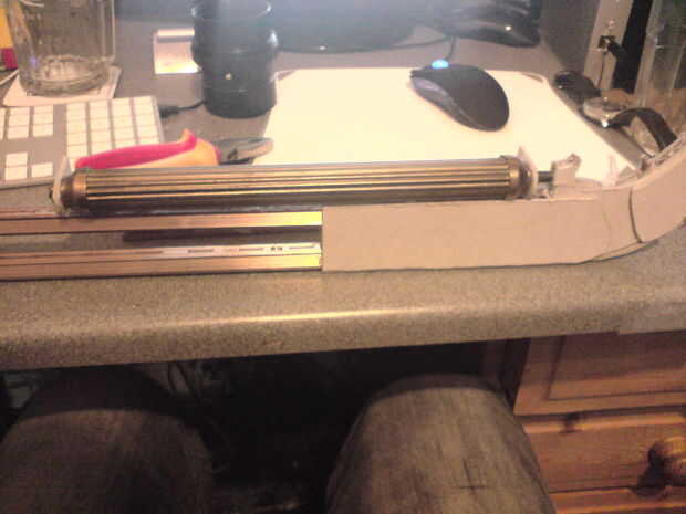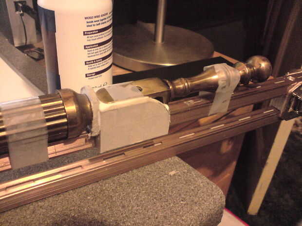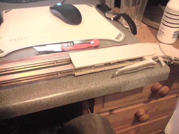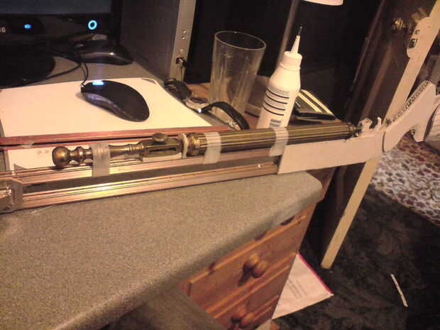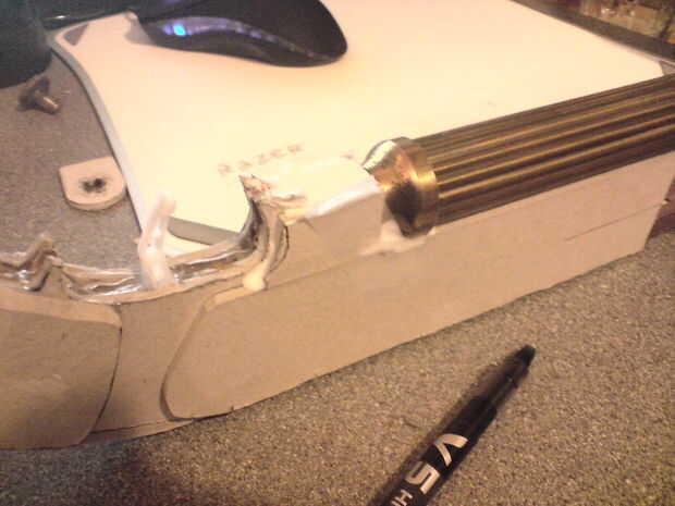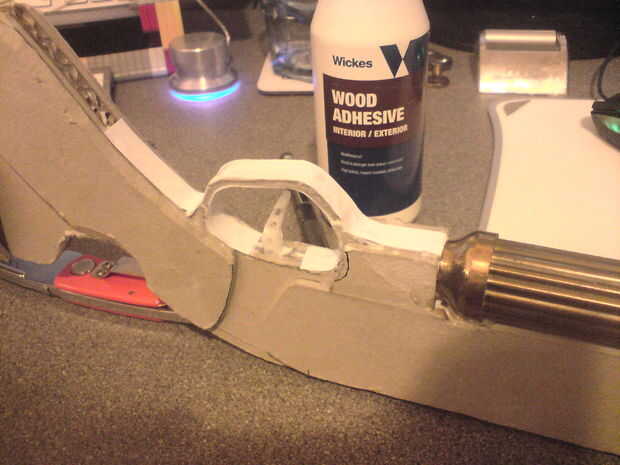 • Cuadro 4-8 mostrar donde decidí quitar una sección 'útil' y añadir mi barril de latón redondo recién encontrado. Había una barra de metal corriente directamente a través de esto, así que había construido tarjeta alrededor de cualquiera de los extremos y había pegado en lugar con PVA - Recuerde pva establece sólido como el plástico, por lo que resistirá muy bien.