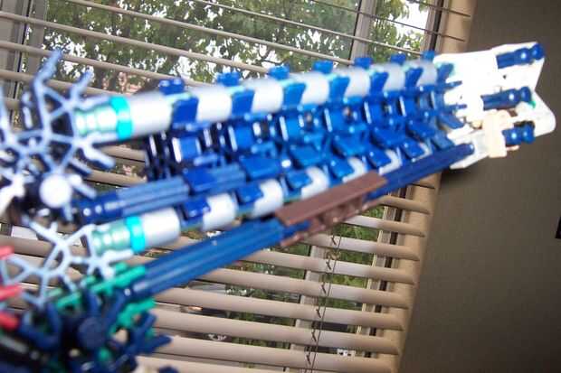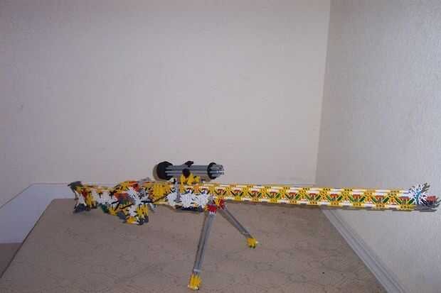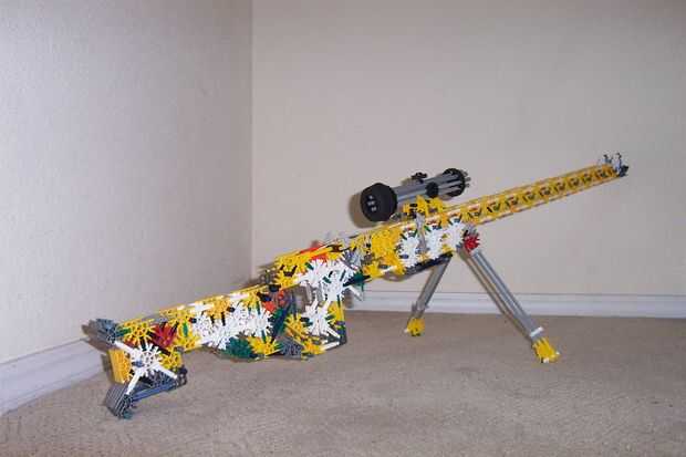 esto es, de lejos mi mejor arma diseñado que he hecho. es muy precisa y con una buena banda de goma tiene un buen rango (40-50 pies). la acción es duradera y el mango diseñado para parecerse a los springfields. está cargada y dispara barras blancas.