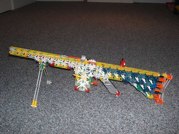 esto es, de lejos mi mejor arma diseñado que he hecho. es muy precisa y con una buena banda de goma tiene un buen rango (40-50 pies). la acción es duradera y el mango diseñado para parecerse a los springfields. está cargada y dispara barras blancas.