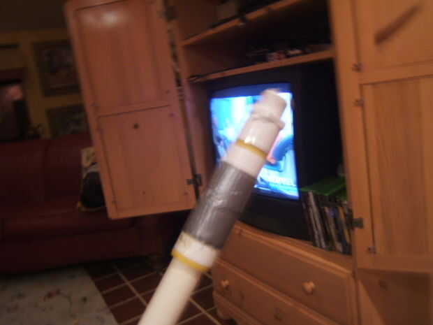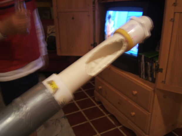 Utilizando un dremel o taladro crear una brecha lo suficientemente grande en la parte inferior del cañón por lo que puede cargar los dardos directamente en la parte inferior sin utilizar una baqueta. Pongo a dos thingers de goma de la manguera en ambos lados por lo que no puede salir aire extra.