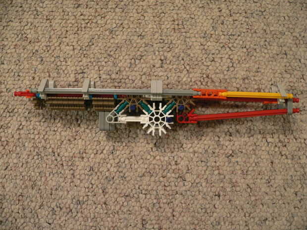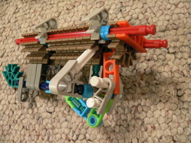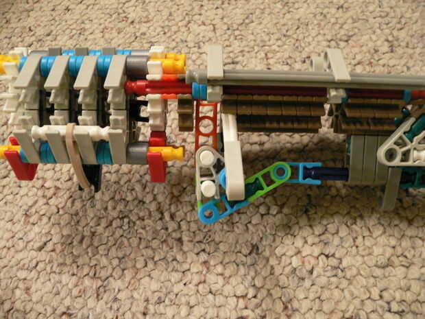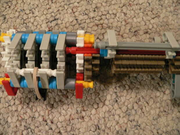 3. una revista. Esto es un poco complicado. Cuadro 5: revista se adhiere a la parte delantera del cuerpo. Esto requiere una pequeña flexión de las barras del rojo. * Nota: no olvides el conector amarillo atrapado entre el cuerpo y la revista. Se encuentra más fácilmente mientras que está sujetando la revista. Cuadro 6: revista conectada con el gatillo demasiado (pero sin el conector amarillo)
