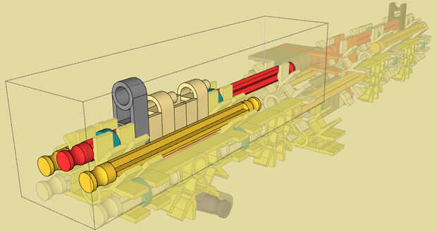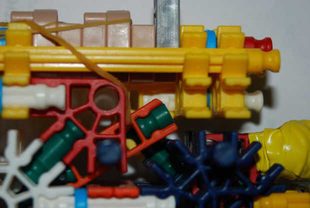 ¿Ahora recuerdo las bandas de goma que coloca en la barra azul? A partir de uno en uno, sacarlos fuera y ellos por encima de los sujetadores tan al contrario engancha en los extremos de las dos barras amarillas acaba de agregar.