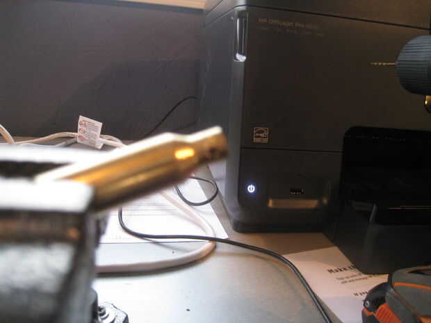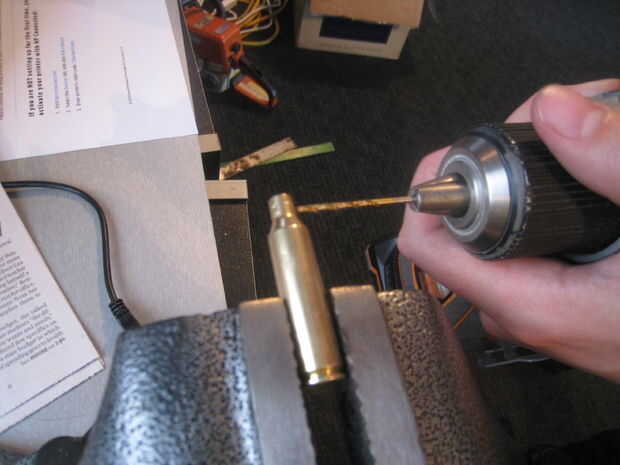 Su cubierta de la abrazadera en la prensa. A continuación, tome el taladro y Taladro broca y taladro a la mitad de la carcasa, taladre a través de sólo la primera capa de metal. Luego tienes que insertar en tu llavero